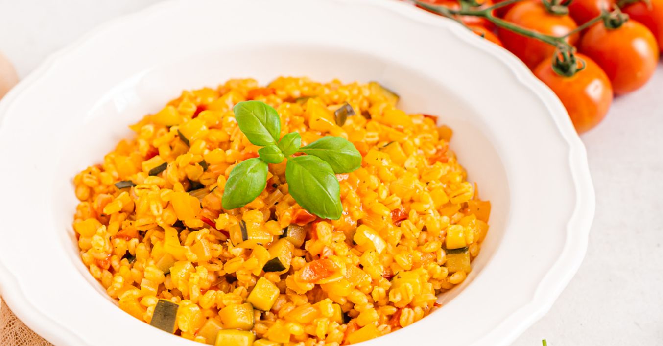 Do menšieho hrnca dáme zohriať 700 ml vody, pridáme 1 ČL soli. Vodu budeme používať na podlievanie krupota. V hlbokej panvici zohrejeme olivový olej, pridáme nadrobno nasekanú cibuľu a cesnak a opečieme do sklovita. Pridáme cuketu, papriku a paradajky nakrájané na menšie kúsky, premiešame a chvíľku opekáme. Následne pridáme prepláchnuté jačmenné krúpy, premiešame a podlejeme vínom. Za občasného miešania privedieme do varu.