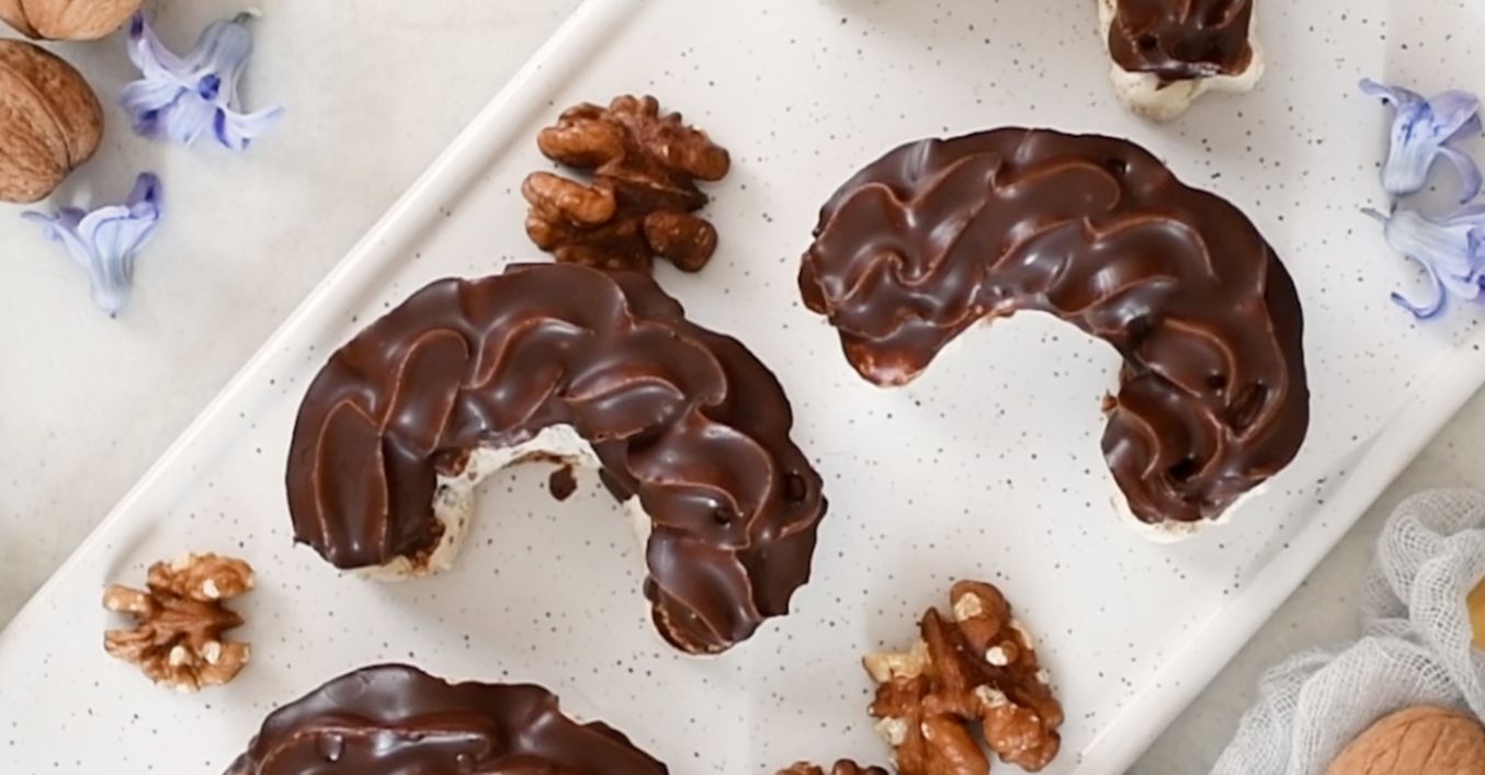 Krém si dáme do zdobiaceho vrecka s hviezdičkovou špičkou. Nastriekame ho na upečené rožteky. Rožteky zachladíme, aby na nich čokoládová poleva pekne zatuhla. Tú si pripravíme roztopením tmavej čokolády a kokosového oleja. Rožteky namáčame a necháme zatuhnúť. Skladujeme ich v chladničke. Najlepšie sú na druhý deň, keď sa všetky chute spoja.
