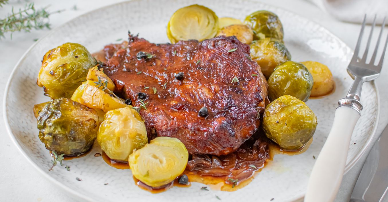 Medzitým si pripravíme prílohu. Zemiaky umyjeme, nakrájame na kocky a spolu s ružičkovým kelom ich premiešame s olivovým olejom a soľou a dáme na pekáč. Asi pol hodiny pred dopečením mäsa pridáme zemiaky a ružičkový kel do rúry k mäsu a dopečieme spolu, kým nie sú zemiaky mäkké a zelenina zlatistá.