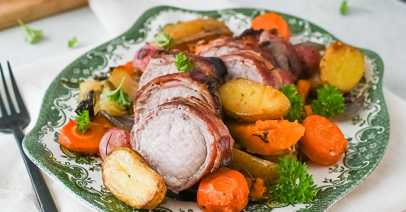 Kým sa zelenina pečie, panenku osušíme, osolíme a okoreníme zo všetkých strán. Zabalíme do plátkov slaniny (na prichytenie slaniny môžeme použiť špáradlá). Panenku sprudka opečieme na oleji zo všetkých strán asi 10 minút. Potom panenku preložíme na zeleninu a dopečieme v rúre približne 8 minút.