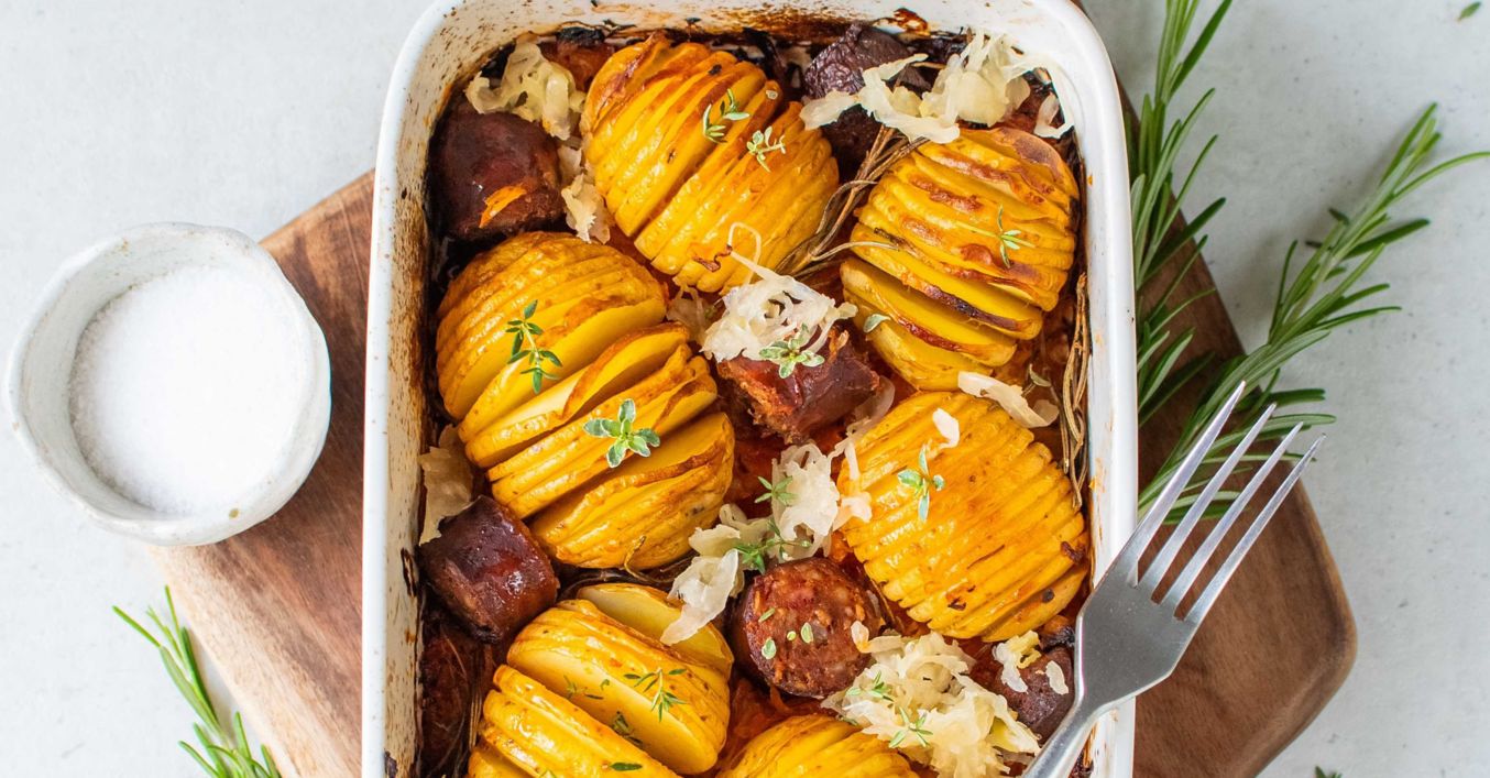 Pečené zemiaky s klobáskou a kyslou kapustou