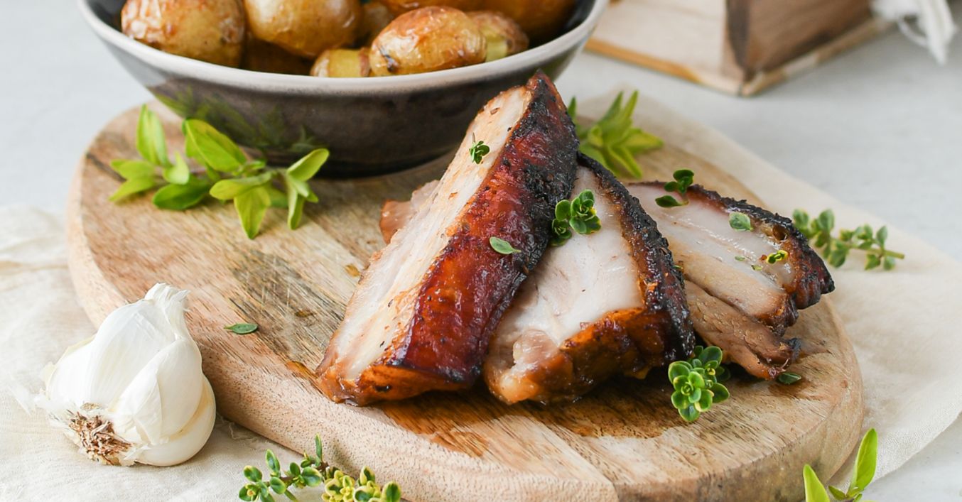 Po uplynutí 45 minút pekáč vytiahneme a stranu s kožou silno osolíme. Mäso vrátime do rúry, kde zvýšime teplotu na 230 °C a pečieme ďalších 30 minút. V tejto fáze už mäso nepotierame, aby sa nám vypiekla chrumkavá koža. Na konci mäso vytiahneme z rúry, prikryjeme alobalom a necháme odležať aspoň 15 minút.