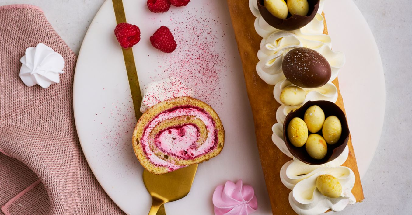 Všetky suroviny na prípravu krému okrem sušených malín vyšľaháme do hladkého a pevného krému. Maliny pred pridaním rozdrvíme a pridáme ako posledné a ručne zapracujeme. Krém rovnomerne nanesieme na malinový gél a piškótový plát zrolujeme. Horkú čokoládu vytemperujeme, nalejeme do formy v tvare vajec a po stuhnutí použijeme na dozdobenie spolu s trochou krému, ktorý ostal. (Autorka receptu: Lucia Gyenesová)