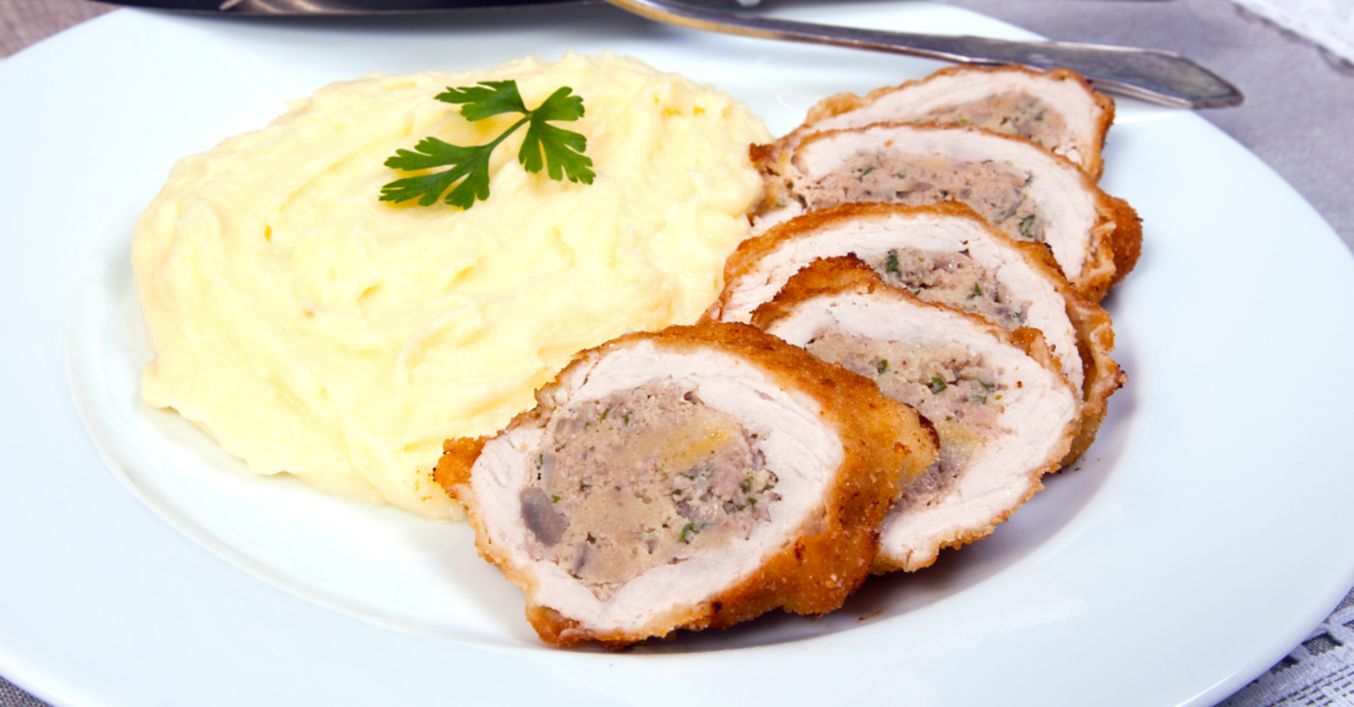 Bravčové rezne umyjeme, naklepeme a osolíme. Na polovicu každého rezňa položíme plnku a preložíme druhou polovicou rezňa. Prešpikujeme a uzatvoríme špáradlami alebo ihlami.