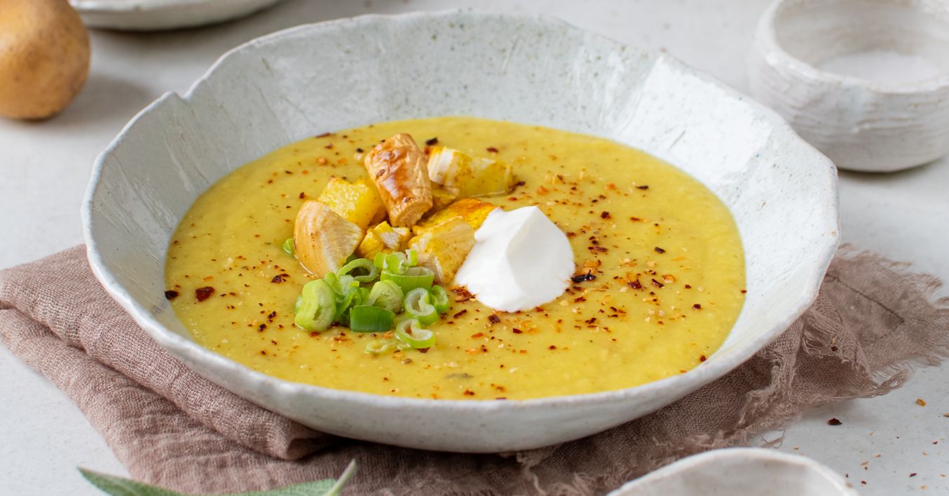 Podávame so zelenou časťou póru, zvyšnou pečenou zeleninou, kopčekom kyslej smotany a pomletými čili vločkami.