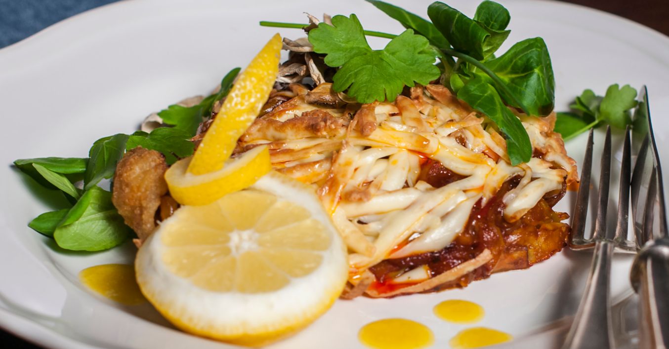 Rybie filé pokrájame na porcie, z oboch strán opečieme na oleji a uložíme na vymastený a strúhankou vysypaný pekáč. Na zvyšnom oleji opražíme cibuľu pokrájanú na kolieska, pridáme očistené šampiňóny pokrájané na plátky, pokvapkáme citrónovou šťavou a trochu dusíme.