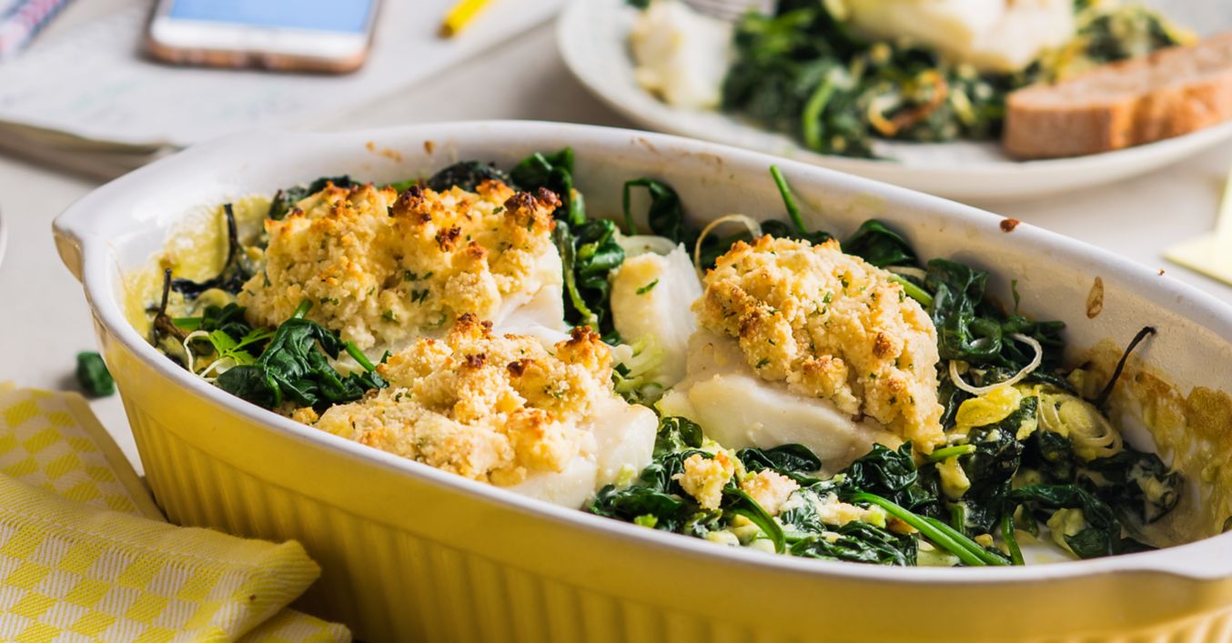 Rybie filé so špenátom necháme rozmraziť. Rúru zohrejeme na 185 °C. Olúpanú a prepolenú cibuľu nakrájame na jemné pásiky. Zemiakovo-cesnakovú polievku zalejeme mliekom a vymiešame dohladka. Čerstvý syr zmiešame s bylinkami, strúhankou, dochutíme soľou, korením a citrónovou kôrou. Špenát vyžmýkame, zmiešame s cibuľou, dáme do formy (20 x 30 cm) a prelejeme zemiakovo-cesnakovou omáčkou. Rybie filé osolíme, okoreníme, navrch rozdelíme syrovo-bylinkovú zmes a upečieme dozlatista (25 – 30 minút).