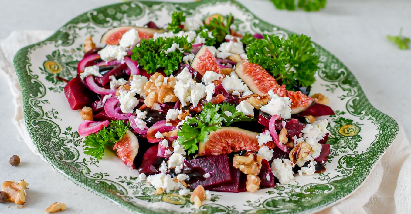Upečenú cviklu dáme na tanier. Pridáme nahrubo nasekané vlašské orechy, najemno nasekanú petržlenovú vňať a na mesiačiky nakrájané figy alebo zrniečka granátového jablka. Polejeme dresingom a pridáme nakladanú šalotku. Na záver posypeme fetou.