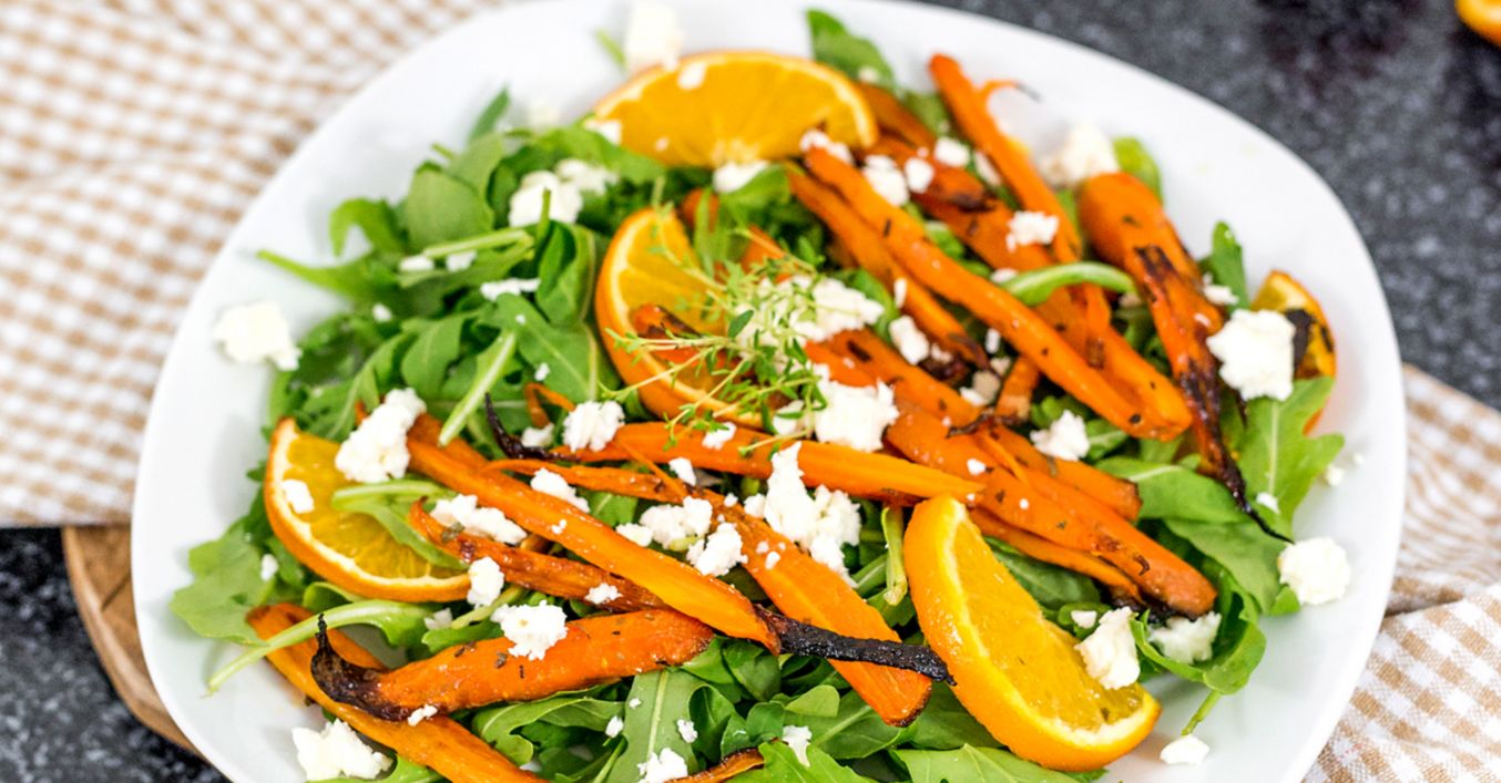 Vložíme do rúry a pečieme 20 minút. Rukolu dáme na tanier, na vrch poukladáme mrkvu, pomaranč a posypeme balkánskym syrom.