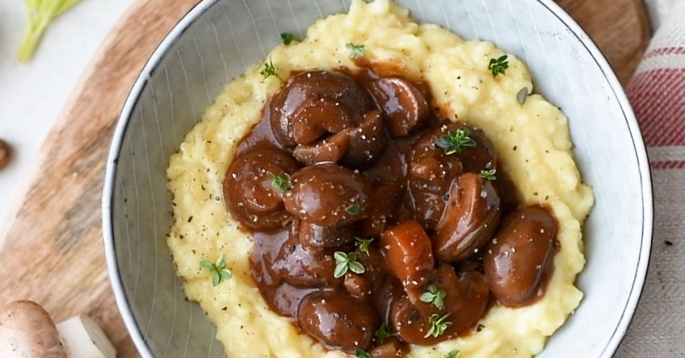 Šalotku ošúpeme a nakrájame najemno. Mrkvu a zeler očistíme, mrkvu nakrájame na kolieska a zeler na malé kocky. Šampiňóny prekrojíme na polovice. Na horúcom olivovom oleji opečieme postupne do sklovita šalotku, zvyšnú zeleninu a dva strúčiky cesnaku. Pridáme šampiňóny, pár minút podusíme a dochutíme bylinkami. Posypeme trochou múky a premiešame. Dochutíme horčicou, pretlakom a červeným vínom. Pár minút povaríme a prilejeme vývar. Varíme asi 30 až 40 minút, kým zelenina a šampiňóny nezmäknú.