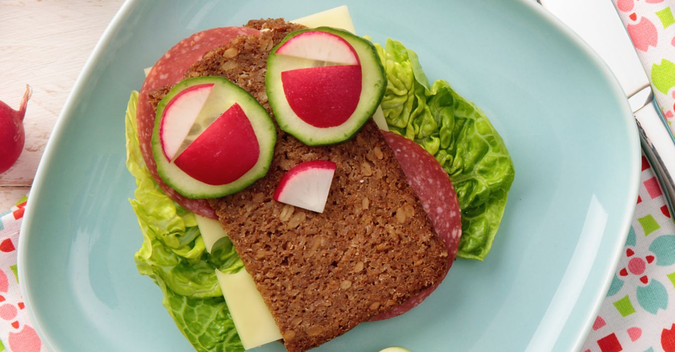 2 krajce chleba natrieme smotanovým syrom a obložíme šalátom tak, aby zboku vytŕčal do tvaru krídel. Na šalát položíme plátok syra, 2 kolieska salámy a krajec chleba.