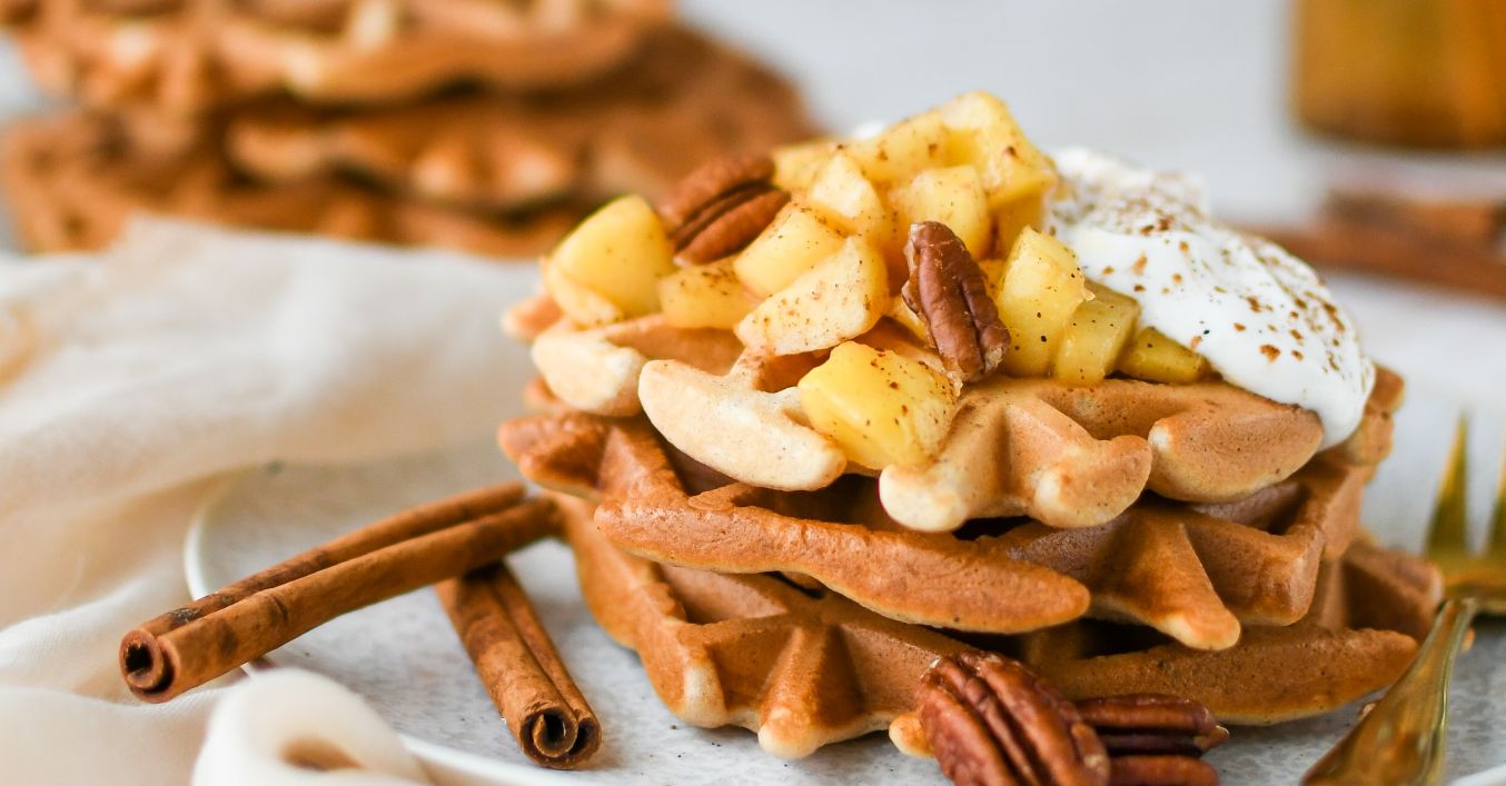 Vafle podávame s bielym jogurtom, medom a uvarenými škoricovými jabĺčkami.