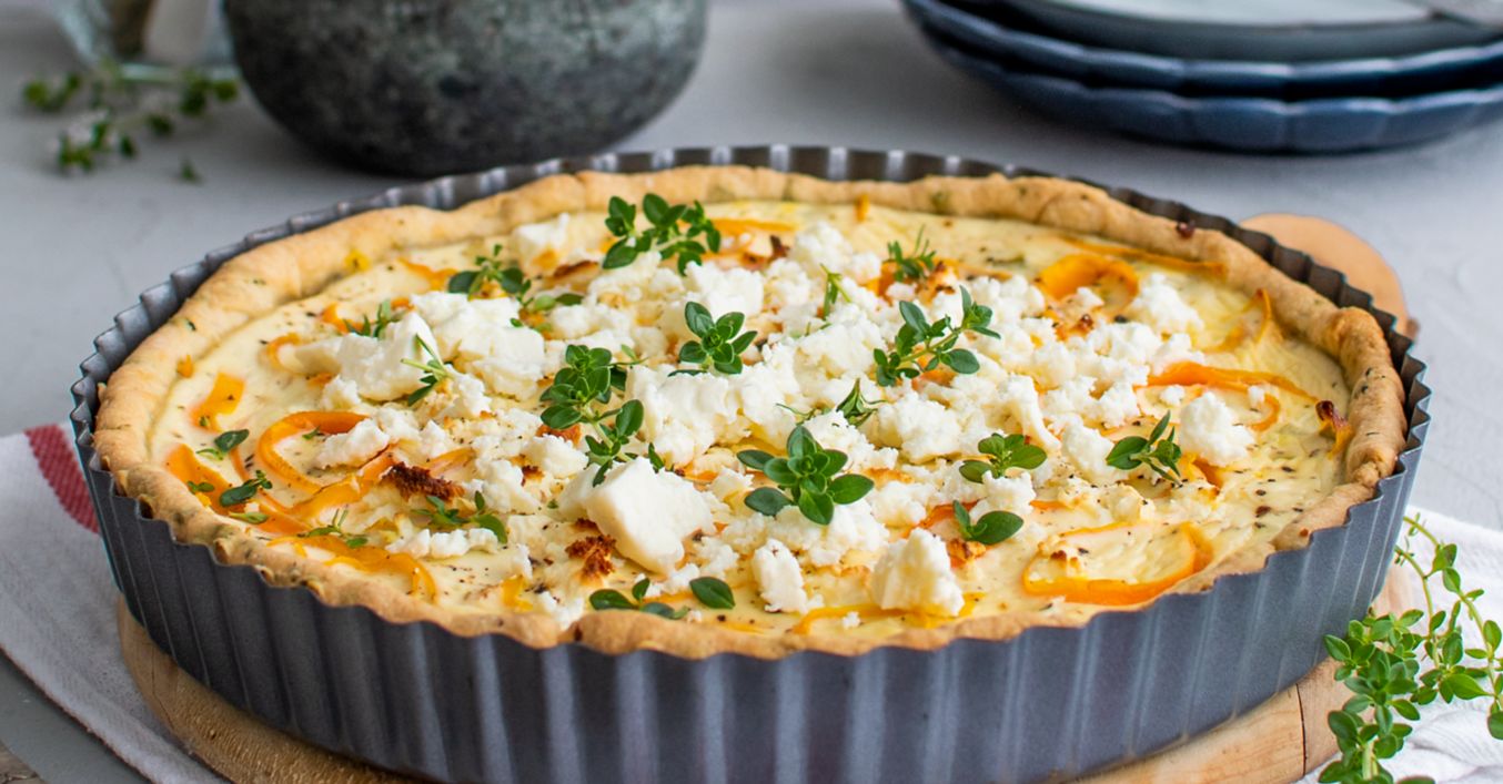 Jarnú cibuľku nakrájame nadrobno. Na spodok predpečeného korpusu dáme polovicu balkánskeho syra, polovicu z mrkvy a jarnú cibuľku. Zalejeme tvarohovou plnkou a na vrch dáme zvyšok mrkvy a syra. Posypeme čerstvým nasekaným tymianom a pečieme pri 180 °C dozlatista. Pred podávaním ešte dozdobíme tymianom.