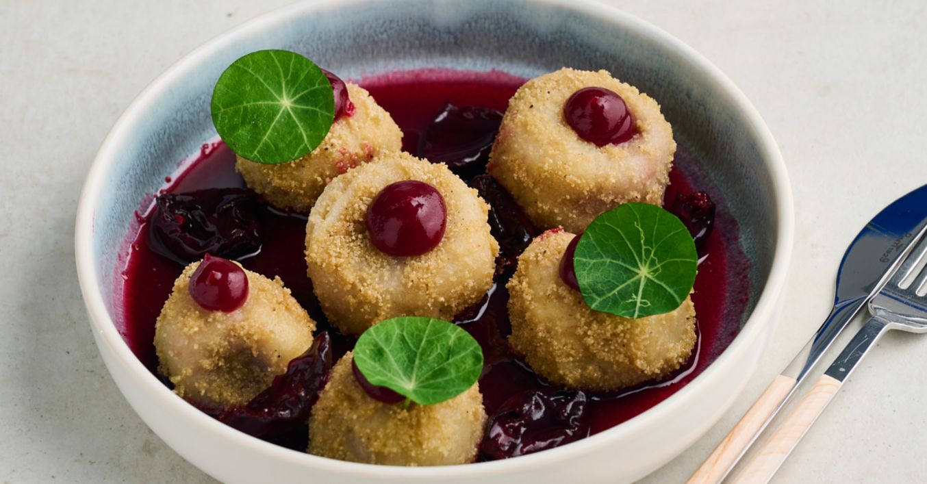 Všetky ingrediencie na višňovú omáčku dáme do rajničky a prevaríme, višňovú omáčku servírujeme spolu so slivkovými guľami.