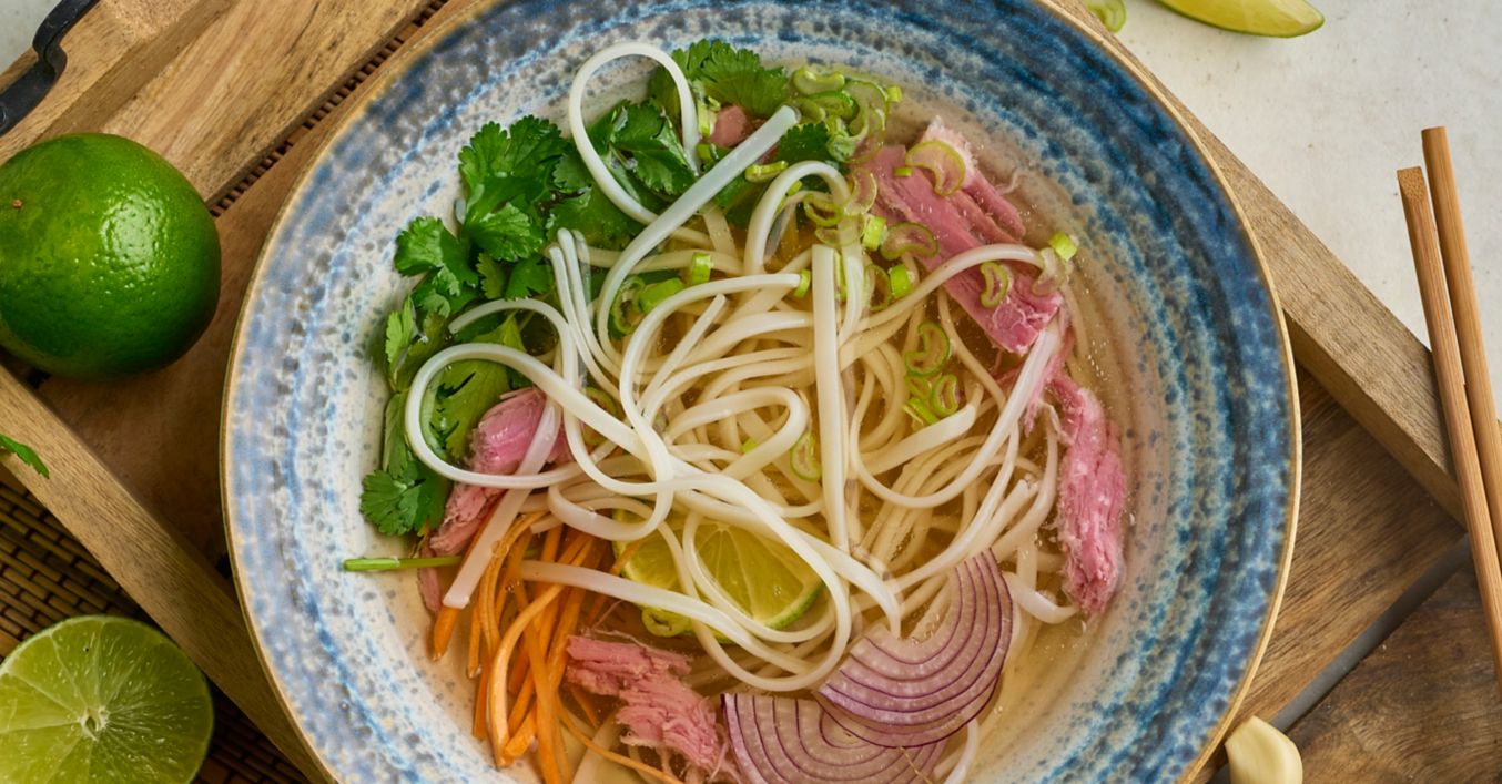 Ryžové rezance uvaríme, dáme do misky s mäsom a zalejeme vývarom. Ozdobíme jarnou cibuľkou, koriandrom, červenou cibuľou, čili a podávame s limetkou a sójovou omáčkou. (Autorky receptu: Baby na mizine)