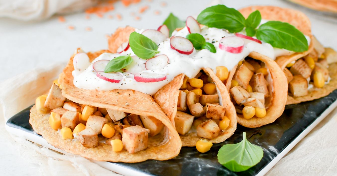 Placky potrieme smotanovou nátierkou, pridáme tofu plnku a dochutíme čerstvými bylinkami a kyslou smotanou.