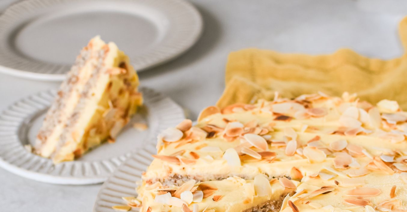 Plátkové mandle si nasucho opečieme na panvici a posypeme nimi tortu. Dáme na pár hodín zachladiť.