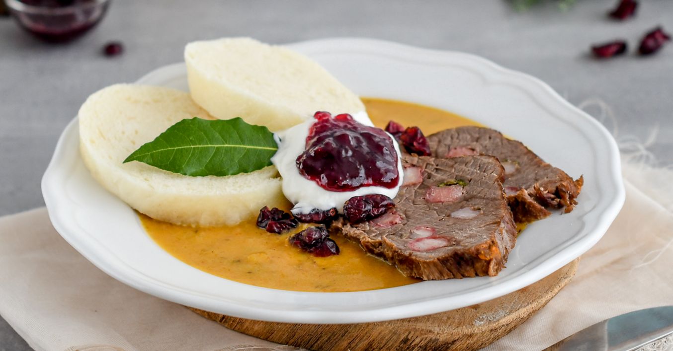 Knedľu nakrájame a zohrejeme nad parou. Mäso nakrájame na tenké plátky. Podávame s omáčkou, kopčekom kyslej smotany a brusnicového džemu.