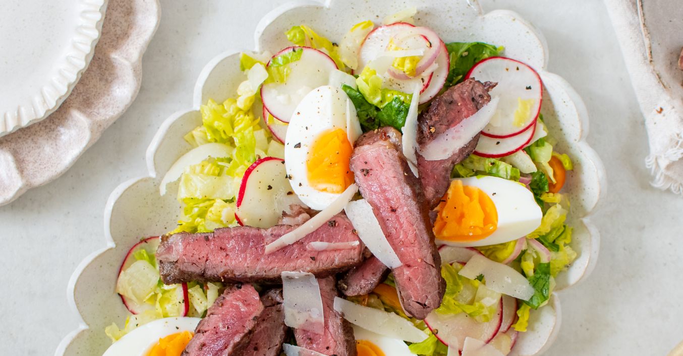 Zatiaľ si uvaríme 2 vajíčka natvrdo. Steak nakrájame pozdĺžne na tenké plátky. Šalát s vajíčkami naservírujeme na tanier a na vrch dáme steak a ešte pridáme pár hobliniek parmezánu.