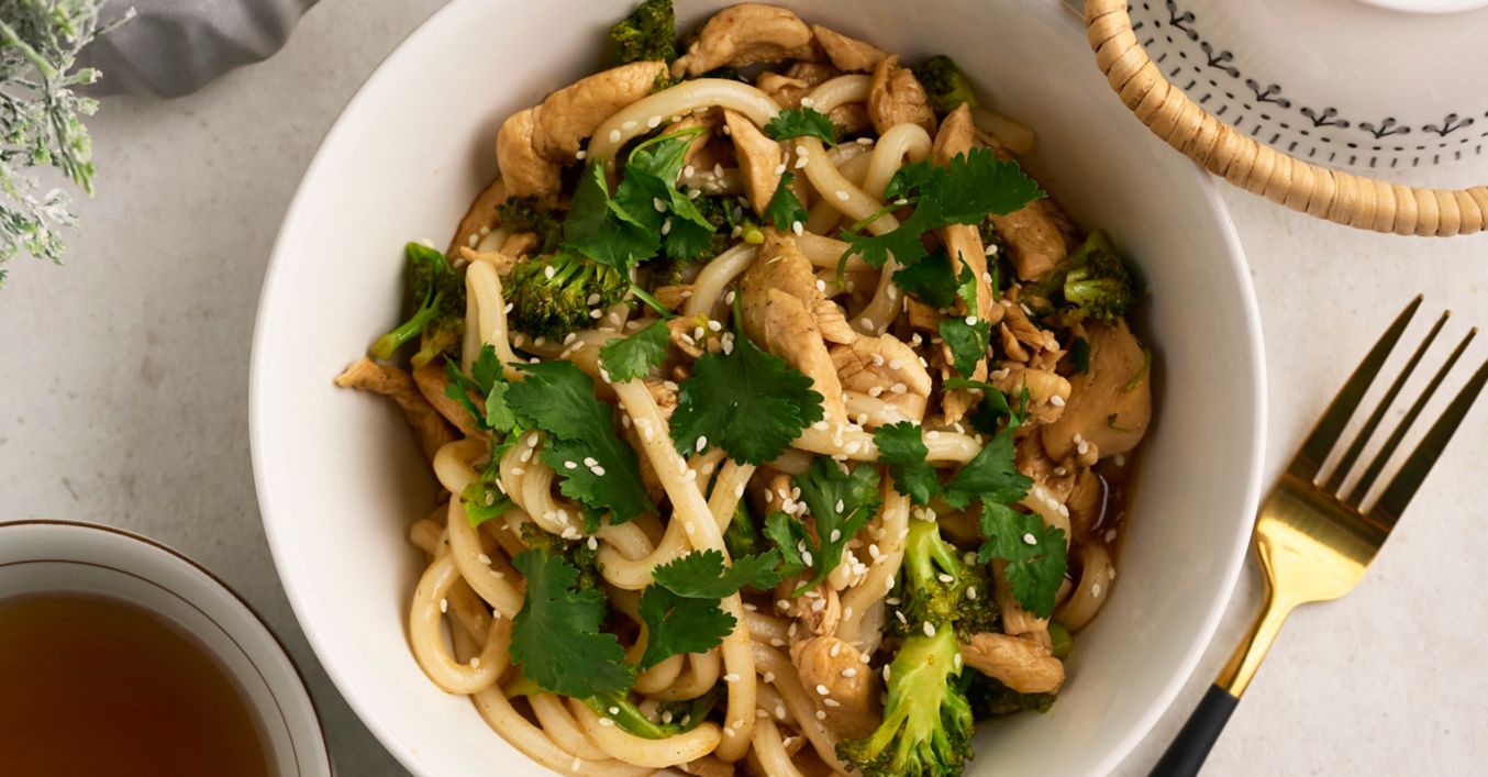 Mäso nakrájame na pásiky, zmiešame ho so sójovou omáčkou a škrobom, necháme 10 minút marinovať. Uvaríme udon rezance, brokolicu sparíme. Mäso opečieme, odložíme bokom a v tej istej panvici restujeme cesnak, zázvor a jarnú cibuľku, pridáme brokolicu. Vrátime mäso, pridáme rezance, omáčku a premiešame. Posypeme sezamom a podávame teplé. (Autorky receptu: Baby na mizine)
