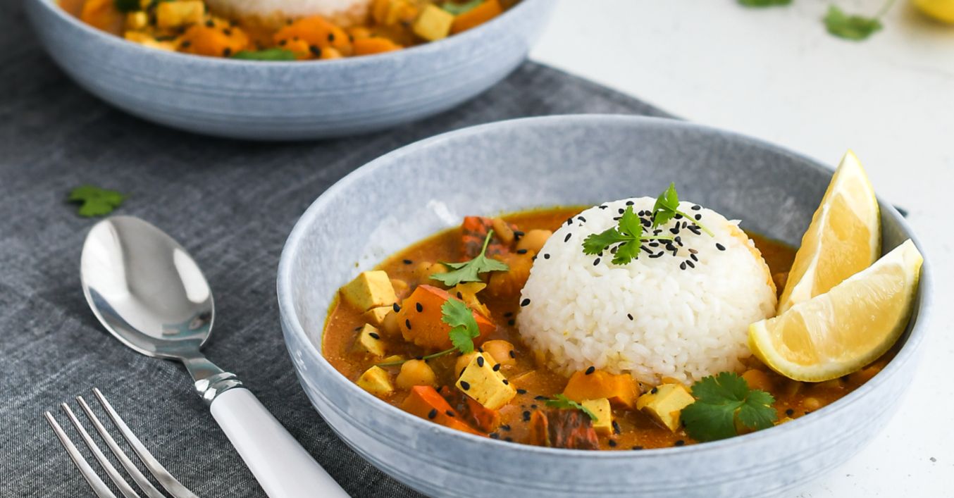 Približne 10 minút pred koncom varenia pridáme nakrájané tofu a scedený cícer. Pár minút povaríme a odstavíme. Dochutíme citrónovou šťavou a čerstvým koriandrom. Podáme s kopčekom ryže a posypané sezamom.