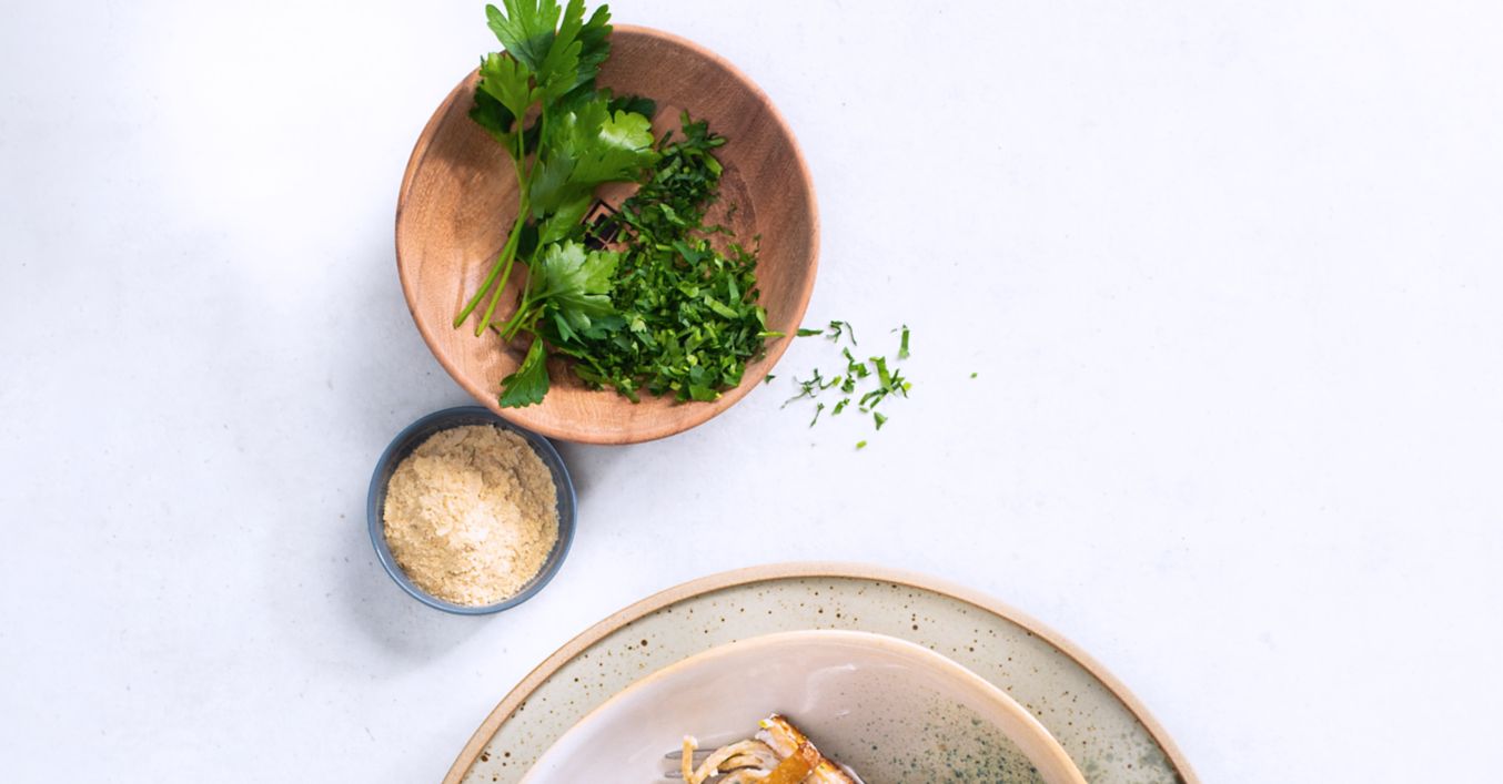 Petržlenovú vňať umyjeme, osušíme a nakrájame nadrobno. Tofu osušíme, najprv nakrájame na hranolčeky, a potom na tenké plátky. Cibuľu ošúpeme a nakrájame nadrobno.