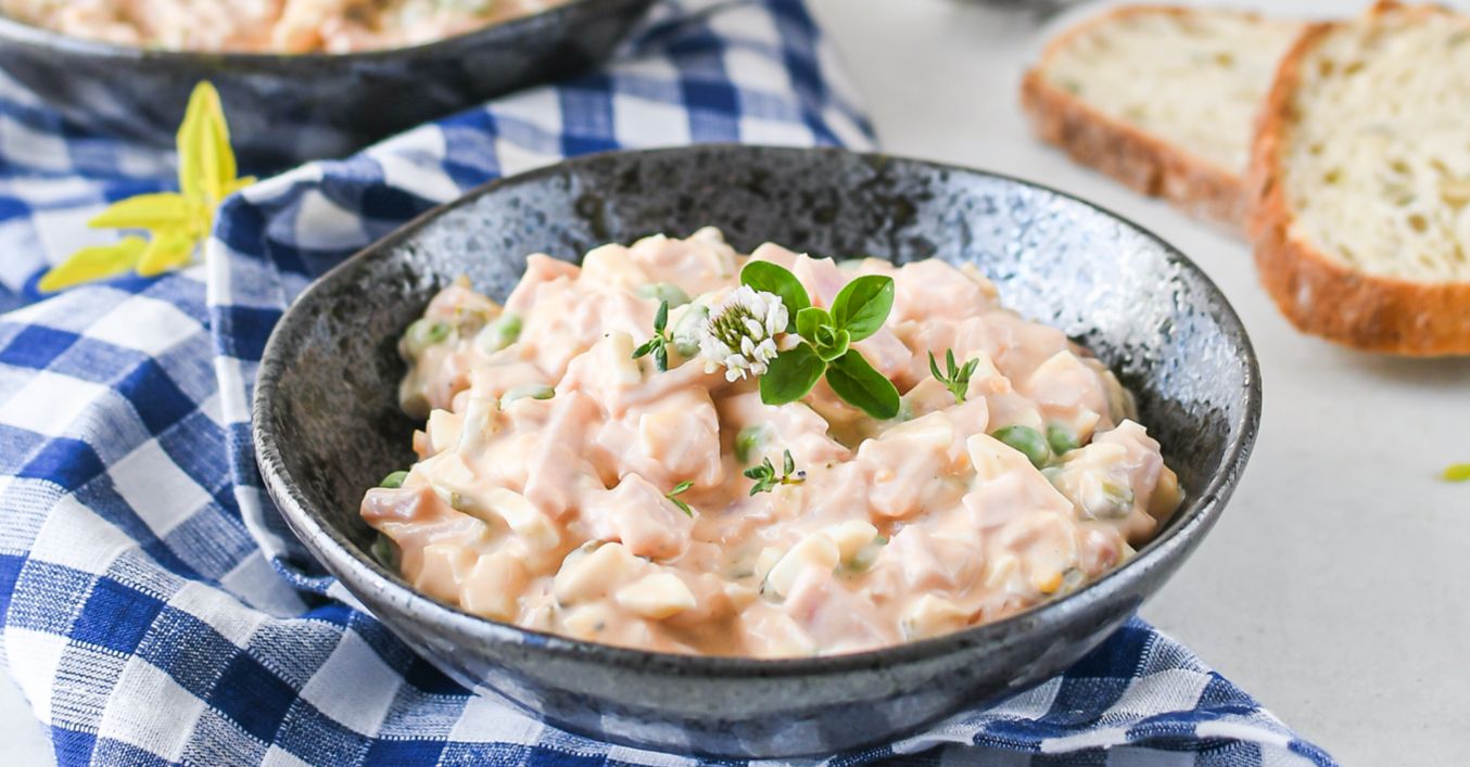 Do misky si nakrájame nadrobno uhorky, cibuľu, salámu a vajcia. Pridáme scedený hrášok, zalejeme vychladnutou zálievkou a majonézou. Všetko dobre premiešame a podávame s pečivom.