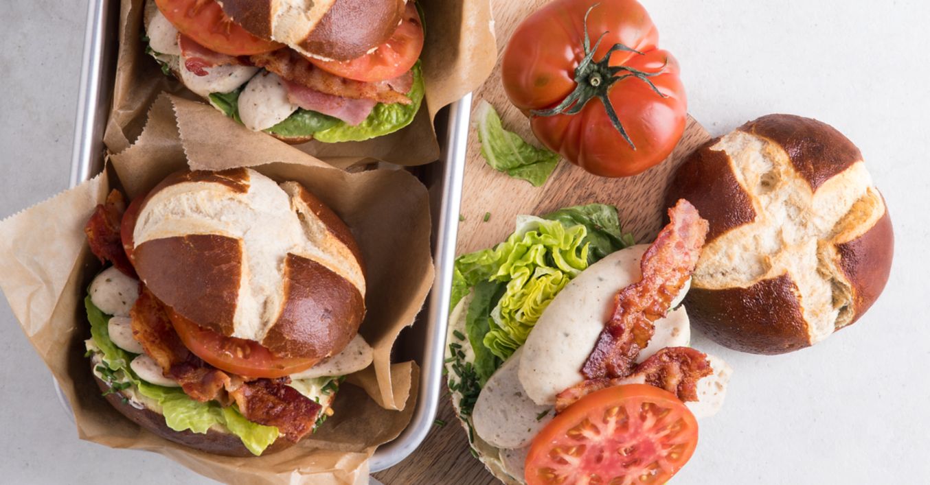Bielu klobásu olúpeme a pozdĺžne nakrájame na plátky. Žemličky obložíme šalátom, bielou klobásou, slaninou a paradajkami. Na to položíme horné polovice žemlí a podávame.