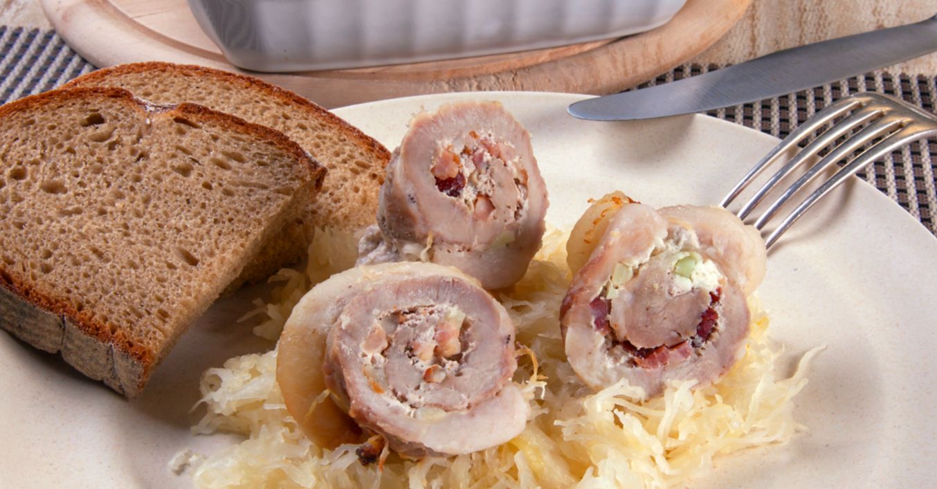 Závitky uložíme do pekáča, posypeme navrchu kyslou kapustou a slaninou , podlejeme trochou vody a upečieme.