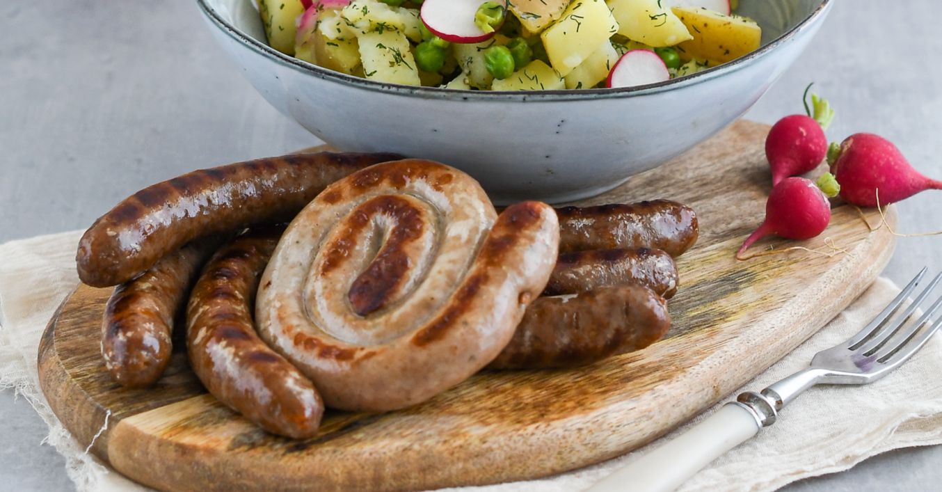 Zemiakový šalát s kôprom a grilovanými klobáskami