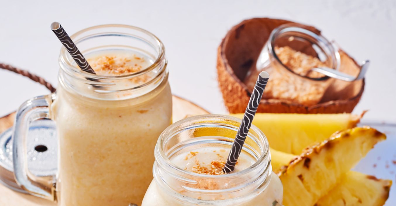 Ananás a banány pomixujeme s kokosovou vodou, ľadom a agávovou šťavou. Nalejeme do pohárom a ozdobíme kokosom.