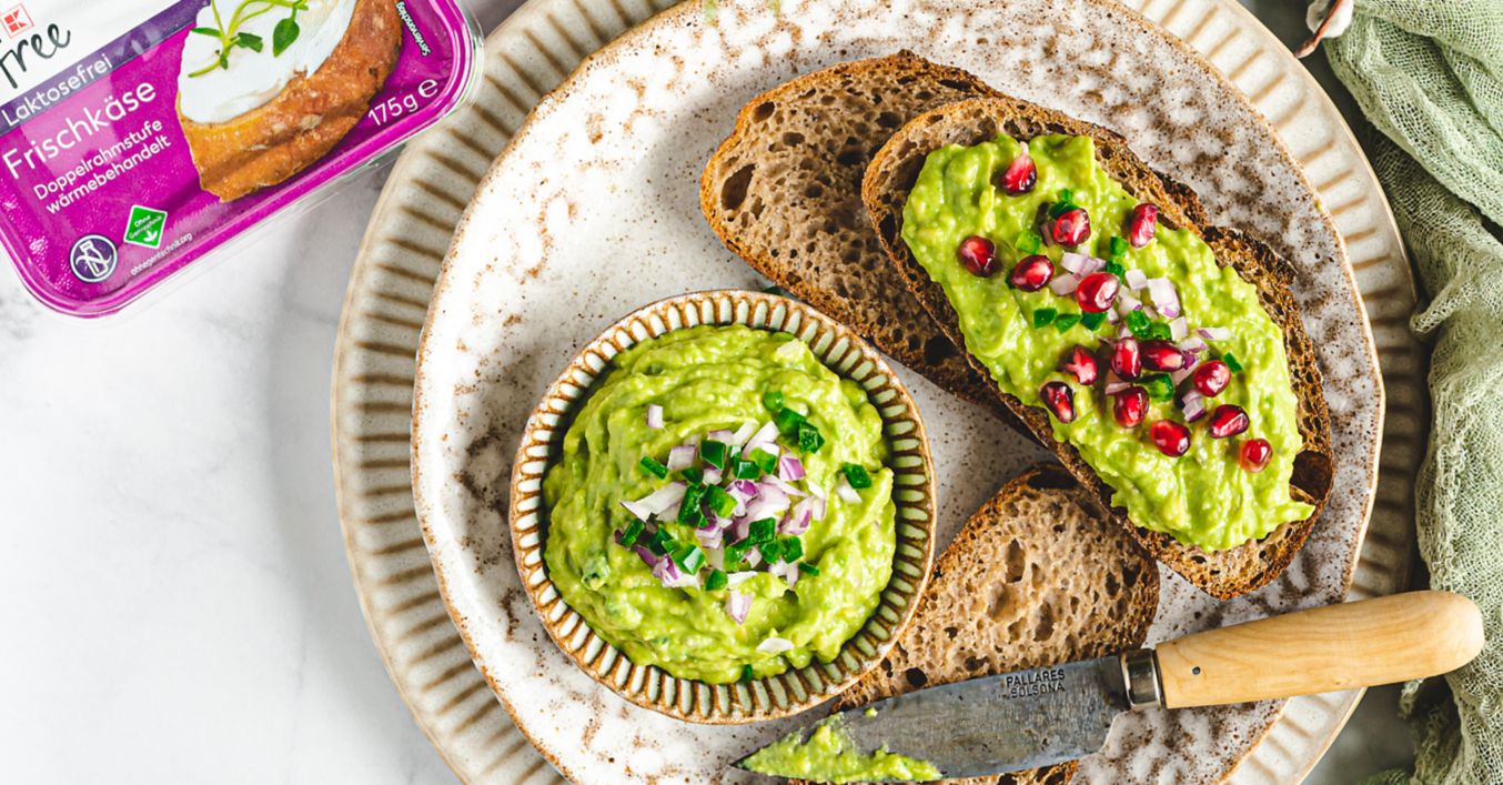 Avokáda prekrojíme na polovicu, vyberieme z nich kôstku a lyžičkou vydlabeme mäkkú časť, ktorú preložíme do misky. Kúsky avokáda rozpučíme pomocou vidličky na kašu, pridáme krémový syr K-free, ktorý nátierku zjemní, a dobre premiešame. Osolíme, okoreníme a pridáme nadrobno nakrájanú jalapeño papričku zbavenú semienok a nasekanú červenú cibuľu. Premiešame, pokvapkáme šťavou z limetky a ochutnáme. Nátierka by mala byť svieža a jemná, ak je to potrebné, dochutíme ju ešte soľou a čiernym korením, prípadne šťavou z limetky. Avokádovú nátierku natrieme v hrubej vrstve na krajec chleba a posypeme semienkami granátového jablka.(Recept pripravila Lenivá kuchárka.)
