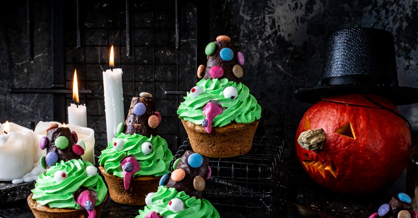 Polevu roztopíme vo vodnom kúpeli. Namočíme do nej mini kornútky a necháme 2 minúty stuhnúť na chladnom mieste. Ozdobíme lentilkami. Na záver ozdobíme mafiny pripravenými očami, nosmi a čarodejníckym klobúkom.
