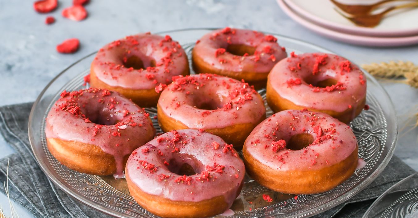 Donutky vysmážame z oboch strán asi 2 minúty na rozpálenom oleji do zlatohneda. Potom necháme odkvapkať na papierovej utierke. V miske zmiešame cukor, džem a mlieko a vymiešame polotekutú polevu. Každú donutku z jednej strany namočíme a ozdobíme mrazom sušeným ovocím.