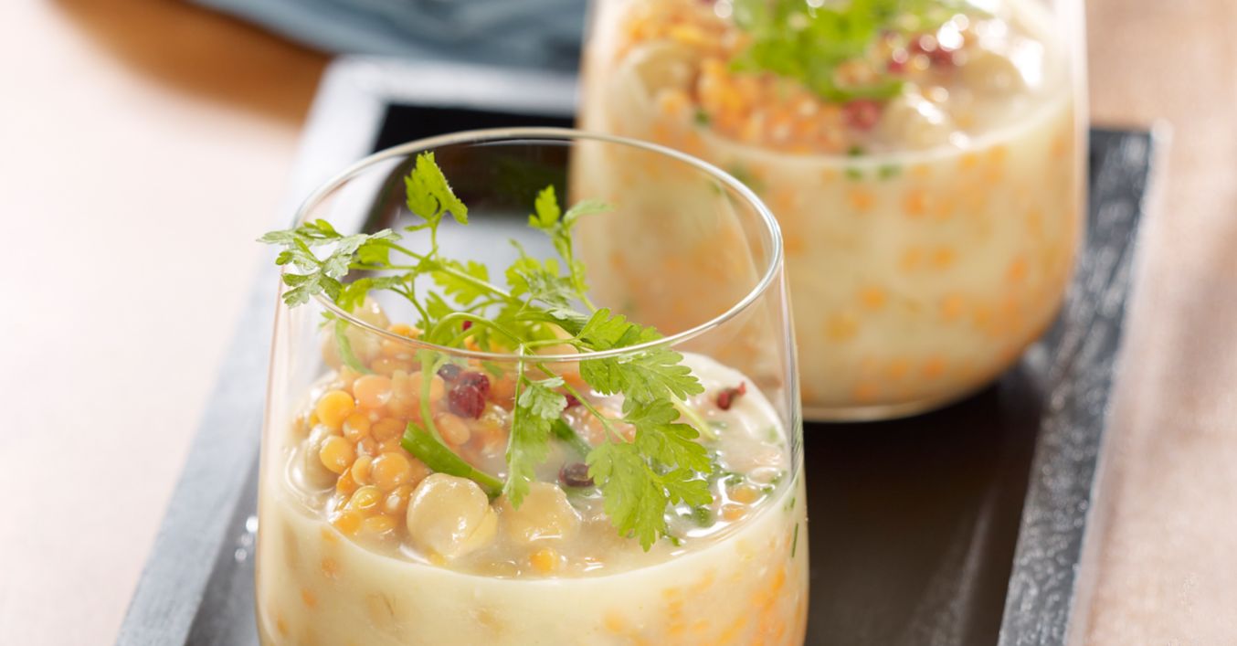 Cícer scedíme, pridáme do zeleninového vývaru a krátko povaríme, pridáme šošovicovú zmes a varíme 30 minút. Zmiešame jogurt a múku a po lyžiciach vmiešavame trochu horúcej polievky.