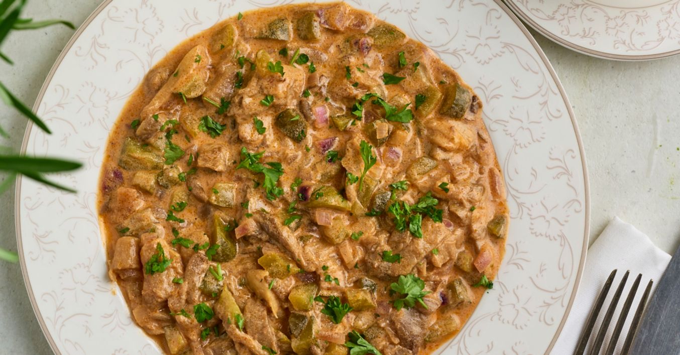 Hlivu očistíme a nakrájame na pásiky, cibuľu nadrobno, cesnak nasekáme a uhorky nakrájame na kocky. Na rozpustenom masle do zlatista restujeme cibuľu. Dodáme cesnak a krátko orestujeme, neskôr hlivu a dusíme 10 minút. Posypeme mletou paprikou, pridáme horčicu a víno. Varíme, kým sa neodparí. Pridáme uhorky, smotanu, soľ a korenie. Nakoniec dodáme kyslú smotanu, premiešame a prehrejeme. Stroganov posypeme petržlenovou vňaťou a podávame. (Autorky receptu: Baby na mizine)