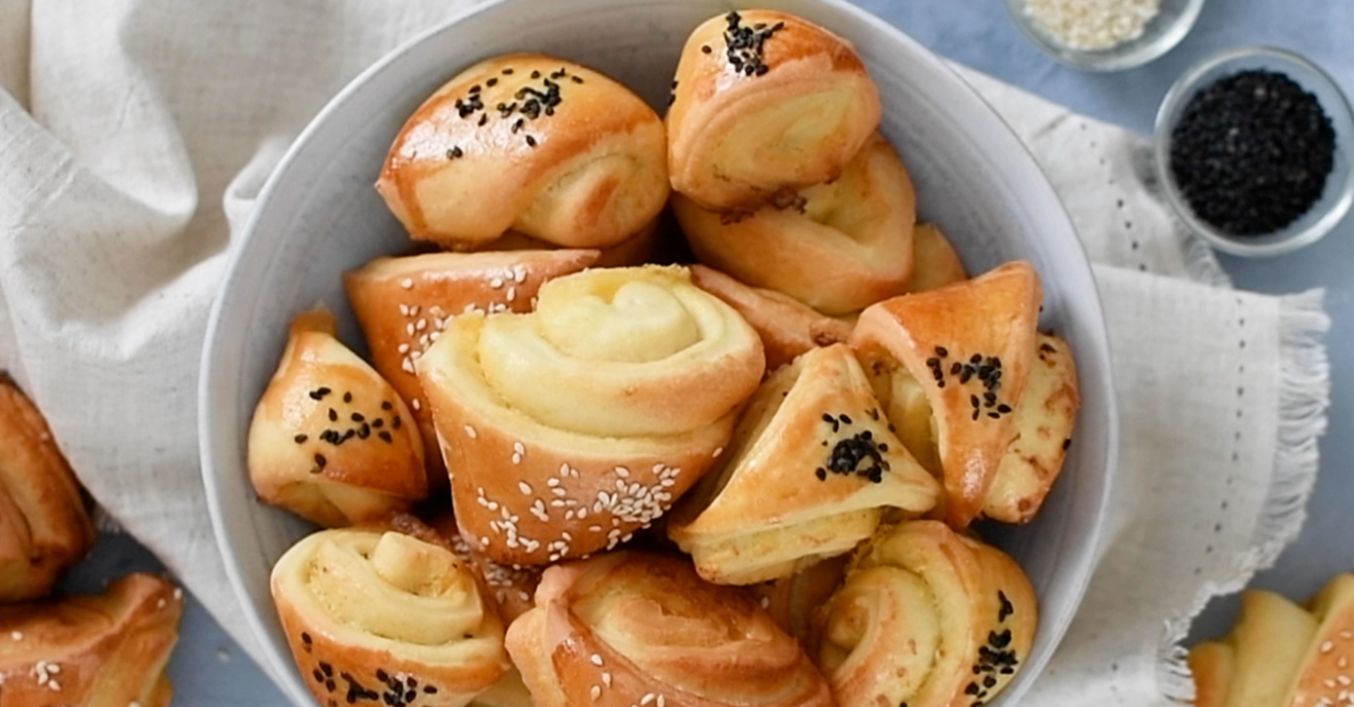 Cestá zakrútime a nakrájame na trojuholníky. Dáme na plech a necháme podkysnúť. Potrieme vajíčkom, posypeme sezamom a pečieme pri 170 °C približne 30 minút dozlatista.