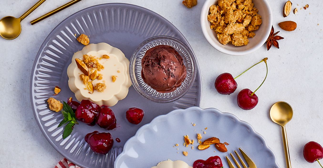Panna cottu vyklopíme z pudingových formičiek, naservírujeme na tanier, ozdobíme čerešnovým kompótom, korenistou mrveničkou, prípadne zmrzlinou K-Favourites Premium kakaové brownie.
