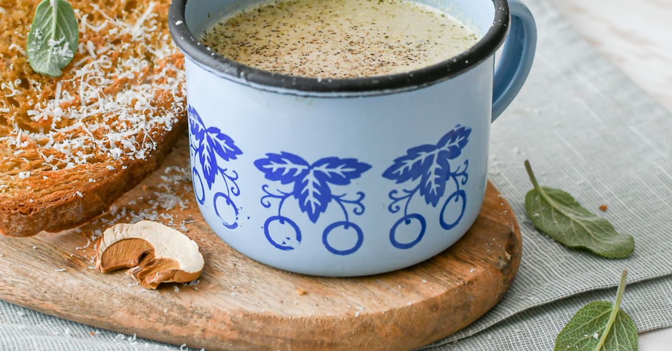 Po 20 minútach odoberieme časť polievky, pridáme smotanu a rozmixujeme. Dáme naspäť do polievky, dochutíme soľou, korením a citrónovou kôrou a necháme prejsť varom. Z kváskového chleba pripravíme hrianku so syrom. Podávame k polievke, ktorú ešte na záver pokvapkáme olivovým alebo hľuzovkovým olejom.