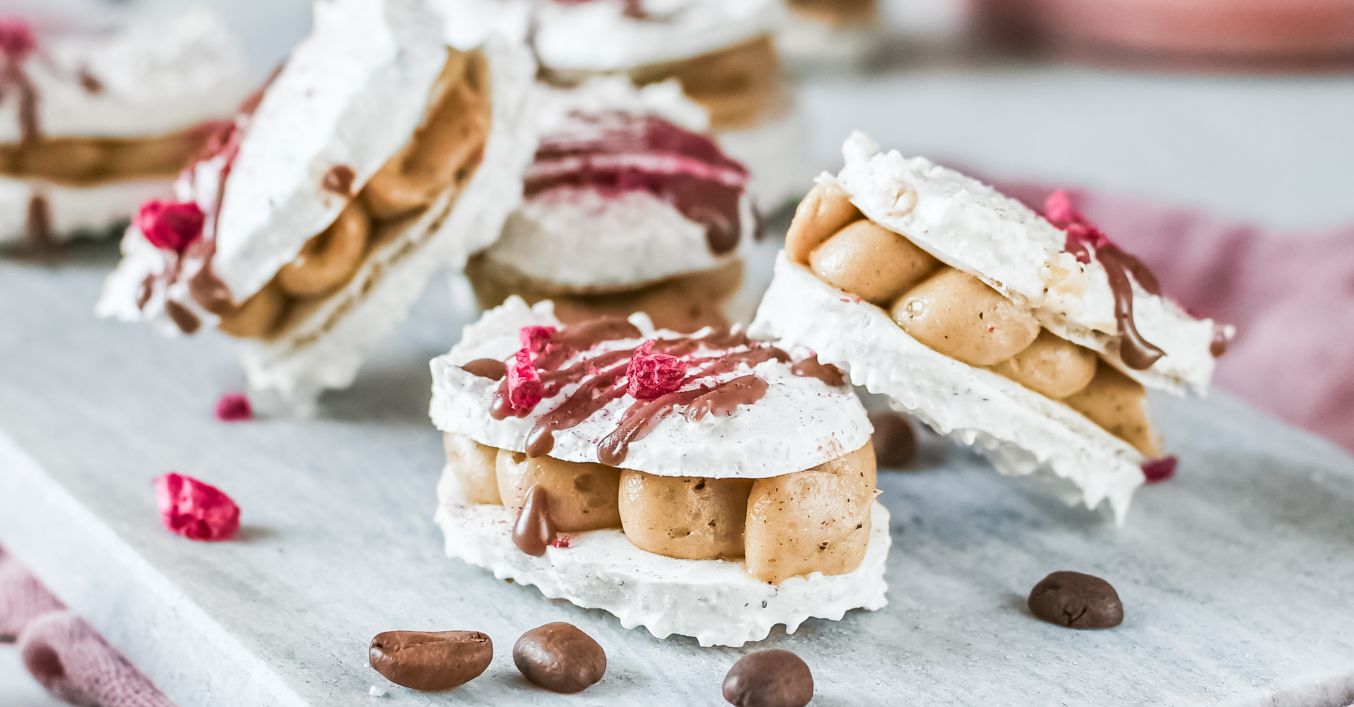 Vychladnuté laskonky odlepíme z papiera na pečenie. Naplníme ich pomocou zdobiaceho vrecúška krémom a zatvoríme. Vrch môžeme poliať čokoládou a dozdobiť mrazom sušeným ovocím - napríklad malinami.