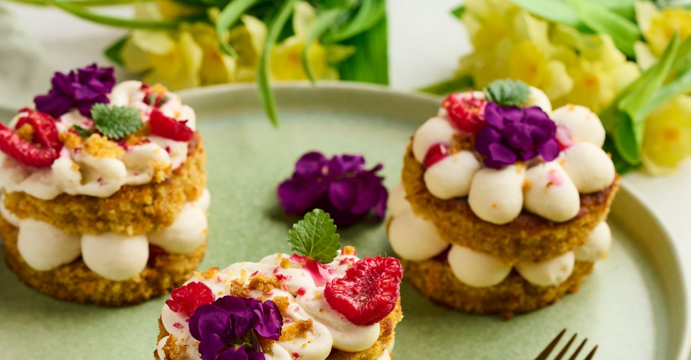 Z upečeného cesta vykrojíme požadovaný tvar (napríklad vajíčka), ktoré prekrojíme, navrstvíme krémom a malinovou omáčkou. Navrch opätovne pridáme krém a dozdobíme malinami, podrveným cestom, jedlými kvetmi alebo mätou.
