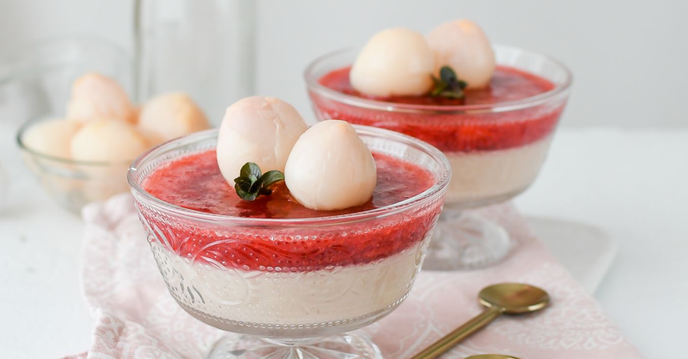Pripravíme si jahodové želé. Jahody rozmixujeme s cukrom a citrónovou šťavou. Dáme ich do menšieho hrnca a zohrejeme pod bod varu. Pridáme 1 ČL práškovej želatíny a na miernej teplote miešame, kým sa želatína nerozpustí. Želé nalejeme na zatuhnutú panna cottu a vrátime do chladničky na niekoľko hodín alebo na noc. Podávame s čerstvým ovocím alebo zaváraným liči.