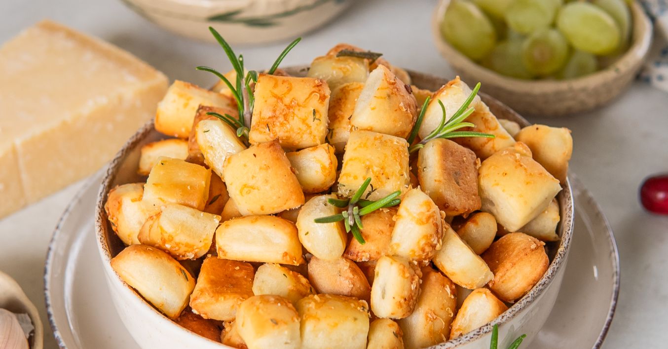 Vykysnuté cesto rozvaľkáme na pomúčenej doske na hrúbku asi 1,5 cm. Preložíme ho na plech s papierom na pečenie a na ňom cesto nakrájame na štvorčeky 2x2 cm. Potrieme ich cesnakovým maslom a štedro posypeme nastrúhaným parmezánom. Môžeme pridať aj čerstvý tymian alebo šalviu.