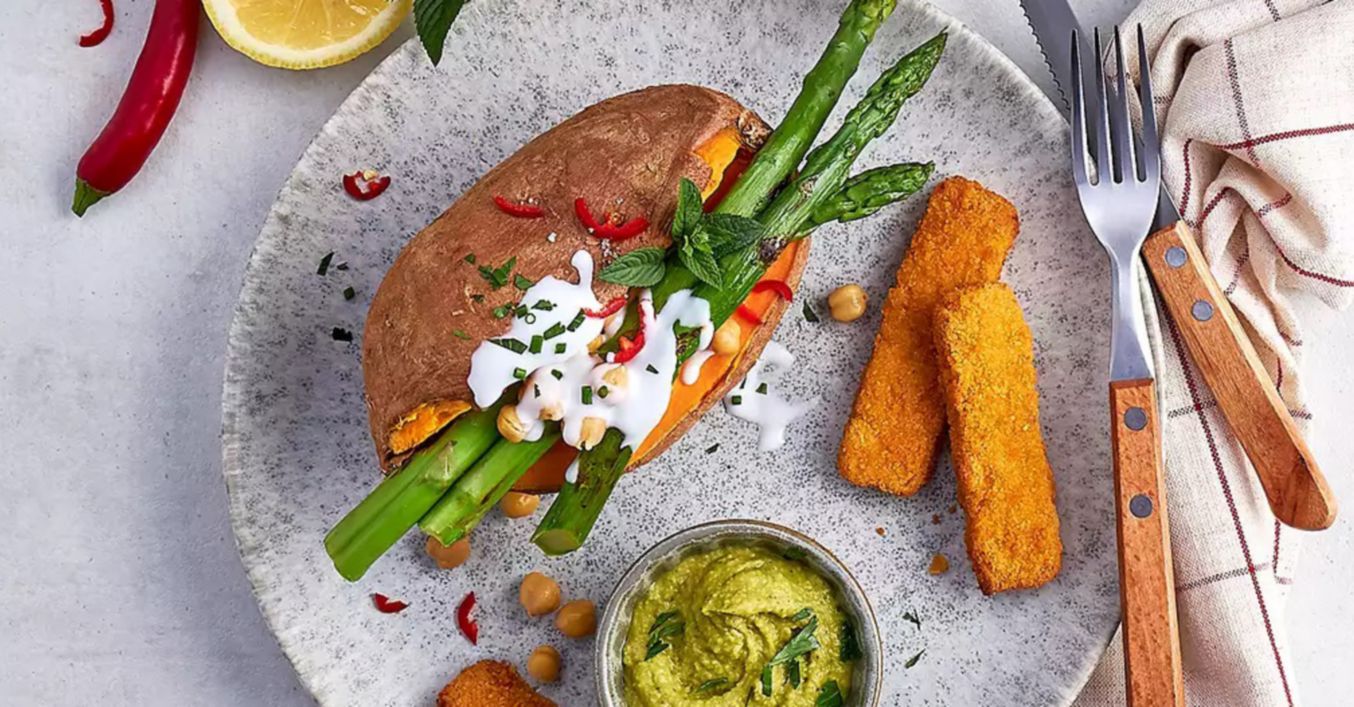 Sladké zemiaky so špargľou vyberieme z rúry a zemiaky pozdĺžne prekrojíme. Navrch dáme špargľu, polejeme cocogurtom, ozdobíme bylinkami, čili papričkou a podávame s hummusom.