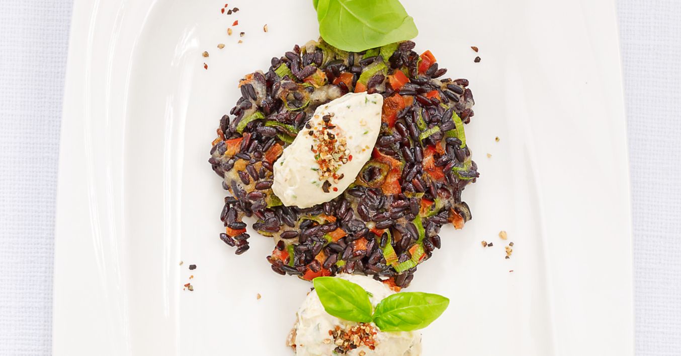 Na prípravu dipu zmiešame smotanu s bylinkami a pestom, potom dochutíme soľou a korením. Na taniere naservírujeme opečené ryžové koláčiky, ozdobíme dipom a podávame. Podľa želania môžeme jedlo obložiť bazalkovými lístkami.