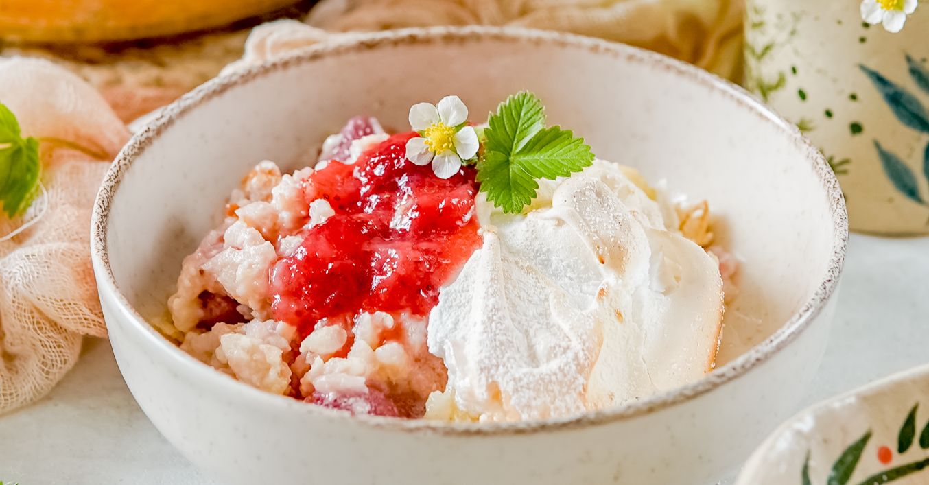 Uvarenú ryžu necháme pár minút odstáť. Zapekaciu misku vymastíme a vysypeme strúhankou alebo kokosom. Do ryže najskôr primiešame žĺtky a potom zapracujeme sneh. Polovicu dáme do zapekacej misky. Pridáme vrstvu mrazených jahôd a potom zvyšok ryže.