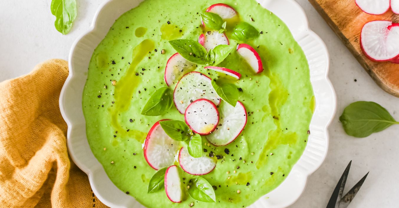 Mrazený hrášok zalejeme vodou, aby sa trochu roztopil. Šalotku nakrájame nadrobno. Orestujeme ju na olivovom oleji do sklovita. Hrášok scedíme, dáme ho do kuchynského robota. Pridáme trochu vody, opečenú šalotku, osolíme, okoreníme, pridáme nasekanú bazalku a rozmixujeme do hladka. Polievku môžeme, ale nemusíme prepasírovať cez sitko. Dochutíme podľa potreby. Podávame s natenko nakrájanou reďkovkou a pažítkovým olivovým olejom.