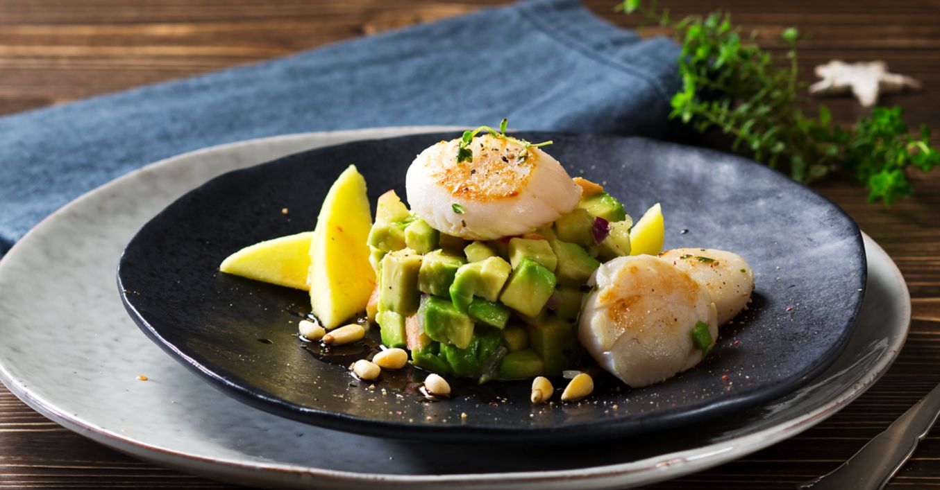 Tatarák z avokáda s opečenými mušľami a salsou z manga