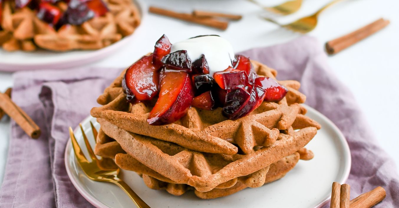 Vafle podávame s karamelizovanými slivkami a bielym jogurtom.