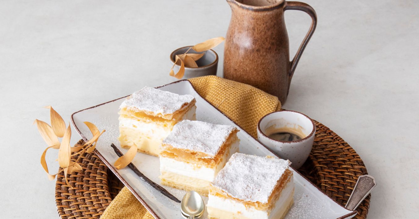 Krém natrieme na upečený plát. Necháme trocha stuhnúť a navrstvíme šľahačku vyšľahanú so stužovačom a s vanilkovým cukrom. Položíme druhý plát a necháme chvíľu odležať v chlade. Posypeme práškovým cukrom zmiešaným s vanilkovým cukrom.